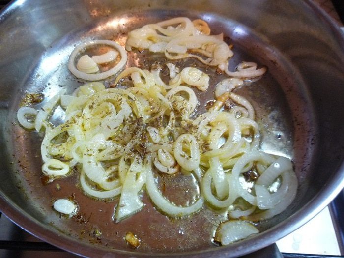 Для лука растопим в сковороде сливочное масло и добавим нарезанный кольцами лук и измельченный тмин. Поджаривайте, постоянно помешивая, пока лук не станет золотистого цвета.