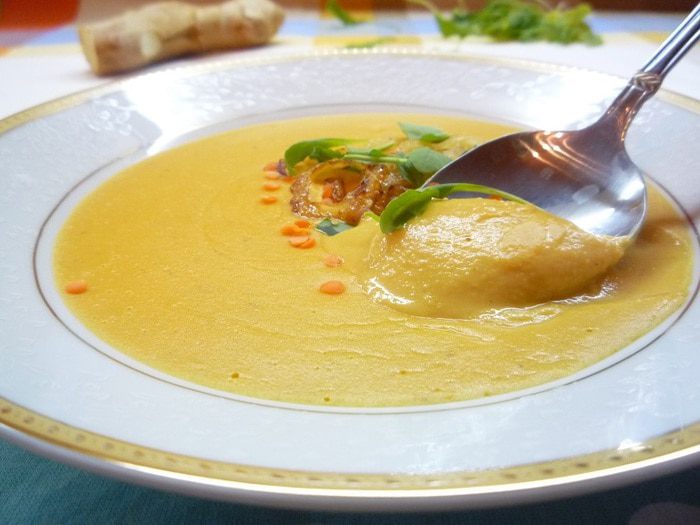 По-осеннему яркий и ароматный суп с пикантной ноткой имбиря, карамелизованного лука и пряной руколой.
