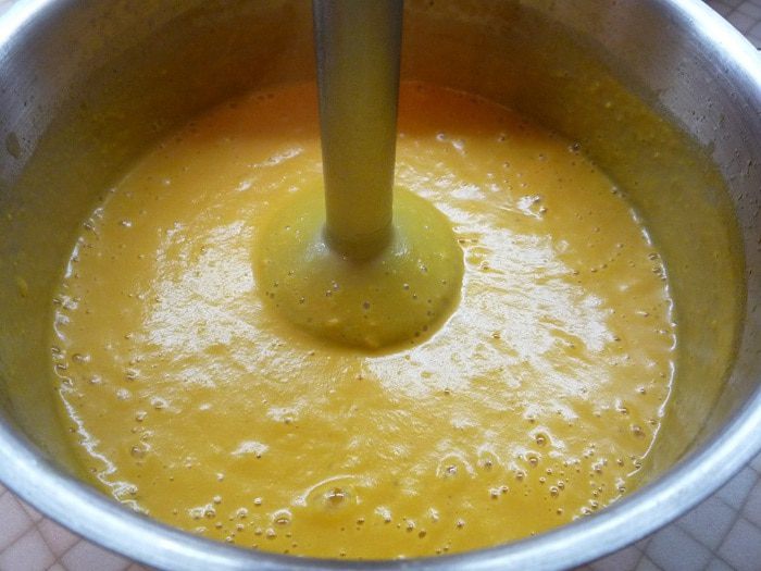 Когда чечевица будет готова, пюрируем суп блендером и добавляем сливки. Густоту супа регулируйте добавлением сливок. Посолим и поперчим по вкусу.