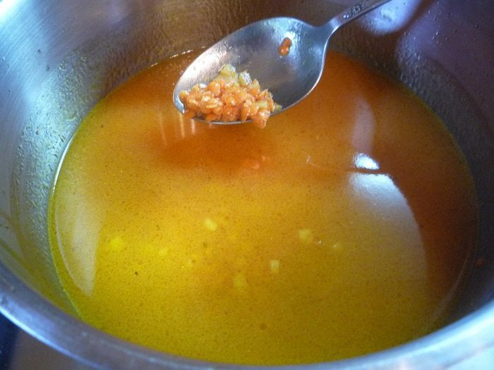 Добавляем куриный бульон и чечевицу, доводим до кипения. Убавляем огонь до минимального и варим суп 25 — 30 минут пока чечевица не станет мягкой.