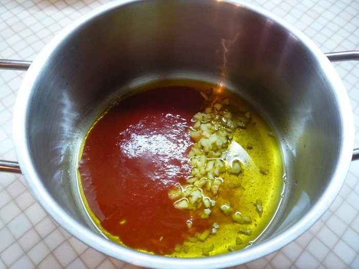 В кастрюлю с толстым дном наливаем растительное масло и разогреваем его. Добавляем куркуму, мелко нарезанный имбирь, томатную пасту и обжариваем 1 — 2 минуты.