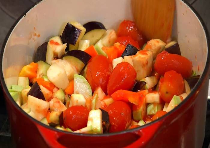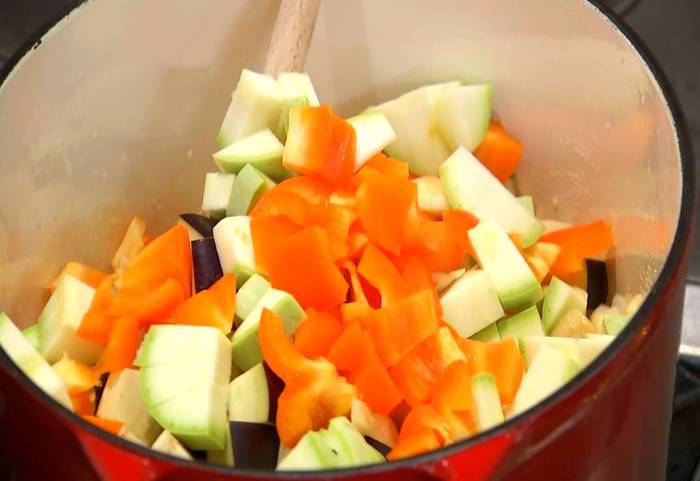 Добавить нарезанные баклажаны, кабачок и сладкий перец, все перемешать и еще немного посолить.