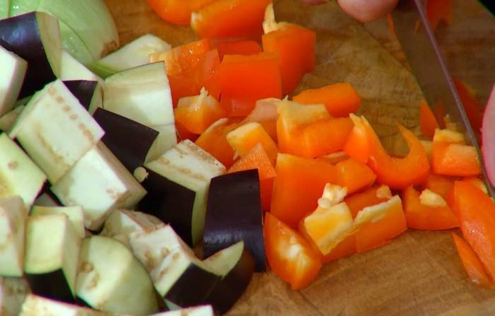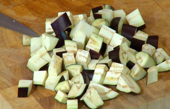 Баклажаны и кабачок нарезать небольшими кубиками.