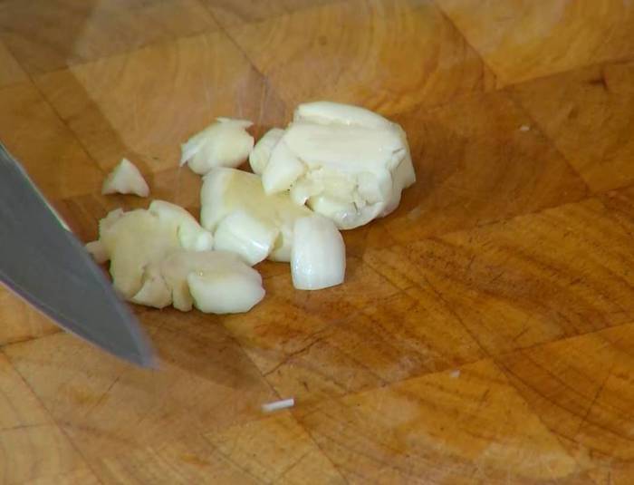 Чеснок почистить и раздавить плоской стороной ножа.