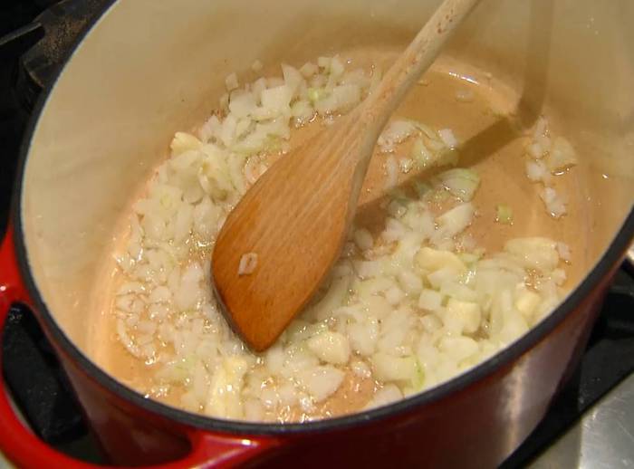 Разогреть в тяжелой кастрюле оливковое масло и обжарить лук и чеснок.