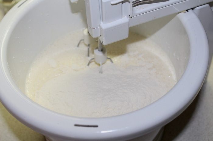 Добавить творожный сыр, растительное масло и йогурт. Перемешать. Просеять муку с разрыхлителем.
