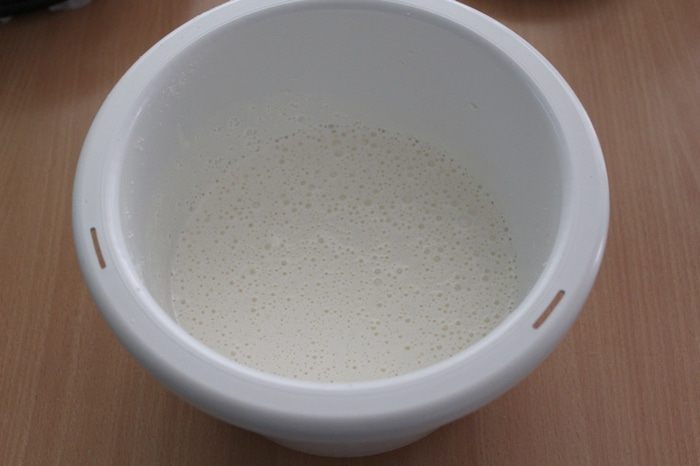 Яйца взбить с коньяком и сахаром до пышной пены.
