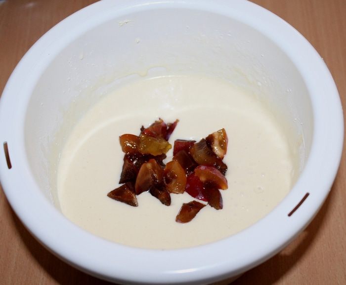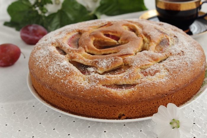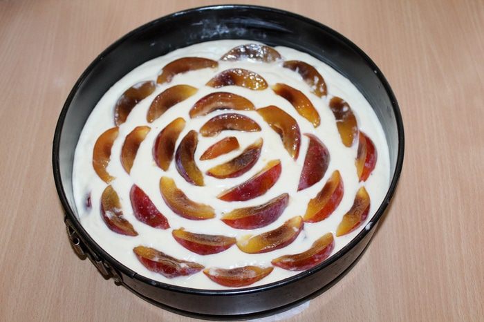 Выложить тесто в форму диаметром 28 см. Остальные сливы нарезать дольками и уложить в виде лепестков.