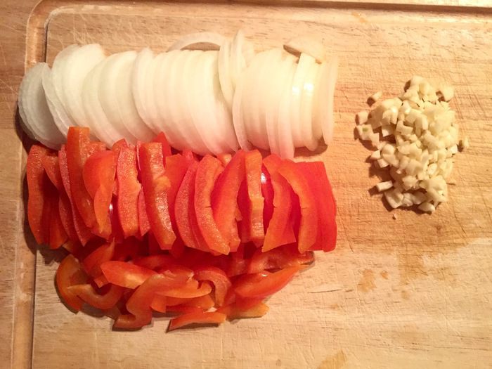 Далее нарезать полукольцами лук и небольшими ломтями болгарский перец, выдавить чеснок.
