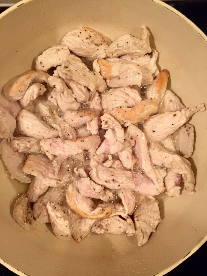 В сковороду добавьте оливковое масло и хорошо разогрейте. Кусочки индейки выложить в сковороду, поперчить, перемешать, чтобы немного подрумянились. Затем огонь чуть уменьшить.