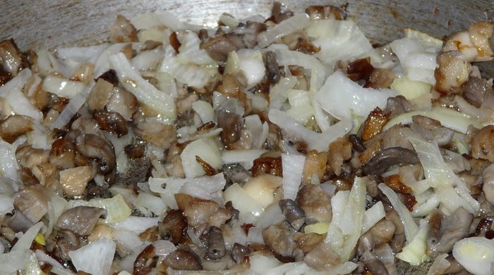 На этой же сковороде, обжарьте грибы и лук. Далее переложите в кастрюлю.
