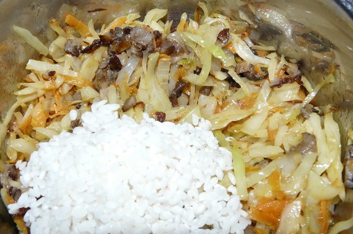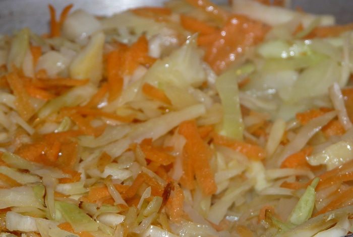 Возьмите сковороду, добавьте немного подсолнечного масло и обжарьте капусту с морковью. Далее переложите в кастрюлю.
