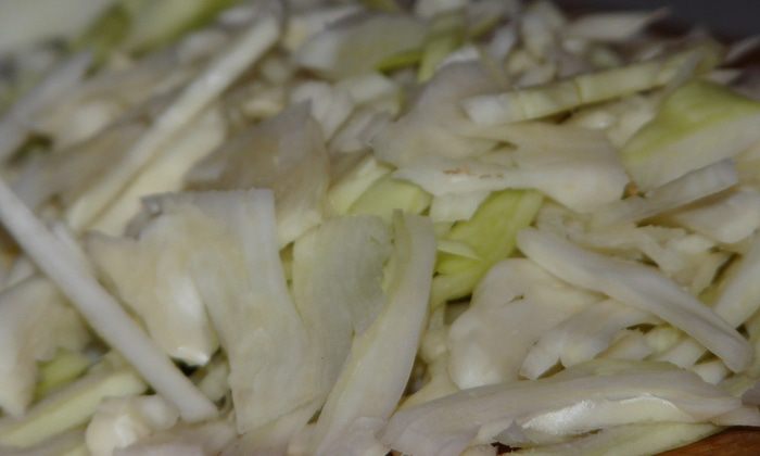 Далее морковь натрите на терке и нарежьте репчатый лук мелкими кубиками. Свежую капусту мелко нашинкуйте.