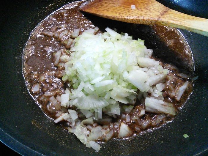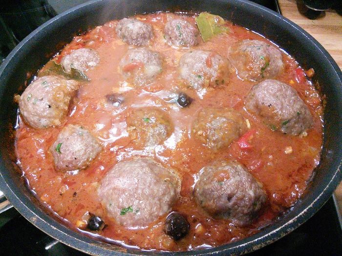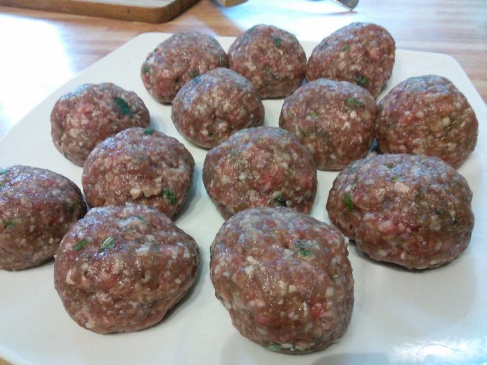 Петрушку и мяту мелко порубить. Смешать в миске фарш (в оригинальном рецепте говяжий) с зеленью, яйцом, щепоткой соды, солью и перцем. Если не хотите использовать соду, замените ее на 30 г панировочных сухарей. Мокрыми руками скатать шарики, выложить на тарелку и поставить в холодильник на 30 мин.