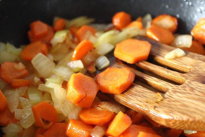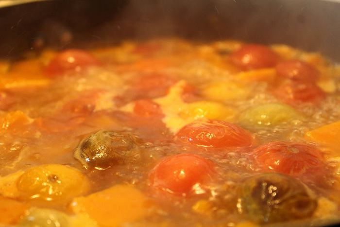 В большой кастрюле закипятим бульон. Сначала в него отправим морковко-луко-чесночную заправку. Как закипит добавить тыковку и помидорки (вместе со шкурками). Посолить, поперчить и дать этому осеннему экстракту тепла и солнышка покипеть буквально 5 — 10 минут на маленьком огне.