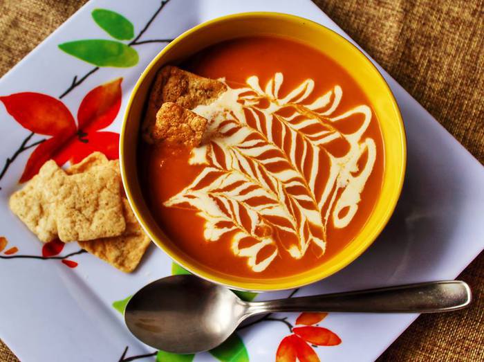 Готовый супчик комбайном или блендером взбить до однородности и подавать со сливками или сметаной. Еще я к такому очень люблю крекеры или хлебные палочки. Вкусно, очень!