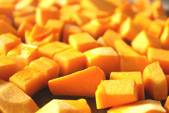 Берем одну тыковку, особенно я люблю вот такие, грушевидные, они очень сладкие. Чистим и режем кубиками нашу солнечную красавицу.