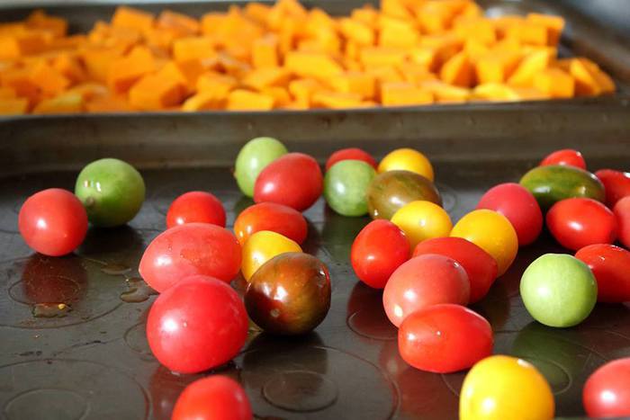 Второй частичкой солнечного настроения будут разноцветные милашки черри. Тыкву выкладываем слоем на один противень, сбрызгиваем растительным маслом. Черри выкладываем на второй противень. Оба отправляем в духовку на 160°С на 20 минут.
