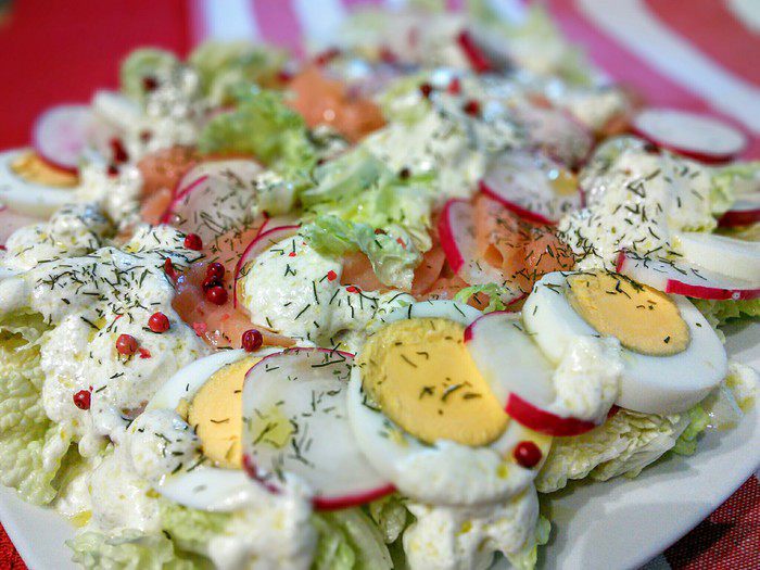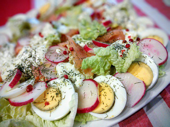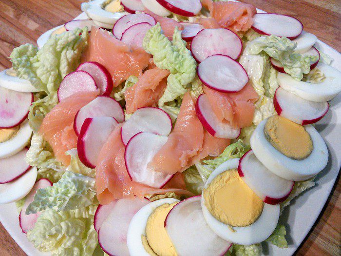 Яйца отварить в подсоленной воде в течении 5 мин, очистить от скорлупы, нарезать кружочками. Редис помыть, так же нарезать кружочками. Салат помыть под проточной водой и обсушить. Порвать руками на порционные кусочки. Лосось нарезать на кусочки (у меня лосось уже тонкой нарезки, поэтому я оставила его как есть).