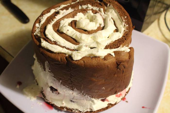Второй половиной круглого бисквита, смазаной кремом, накрыть рулет. Оставшимся кремом обмазать весь торт.