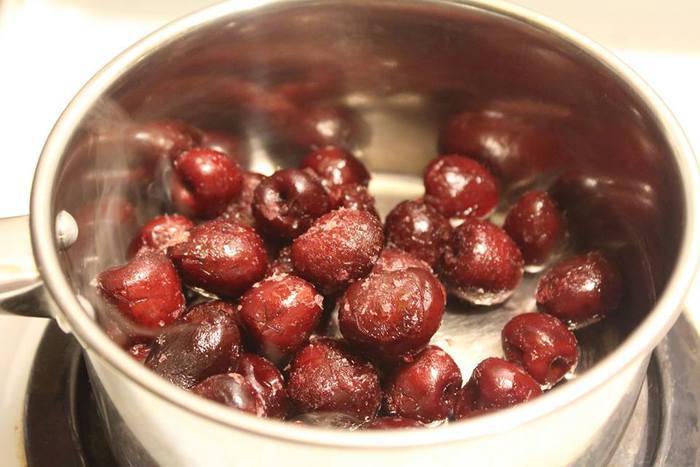 Замороженные черешни (можно и свежие, главное без косточек, можно и вишню, клубнику, малину, персики) залить водой, чтоб покрыло полностью, добавить немного сахара и дать закипеть. Слить на дуршлаг, чтоб стек сироп.