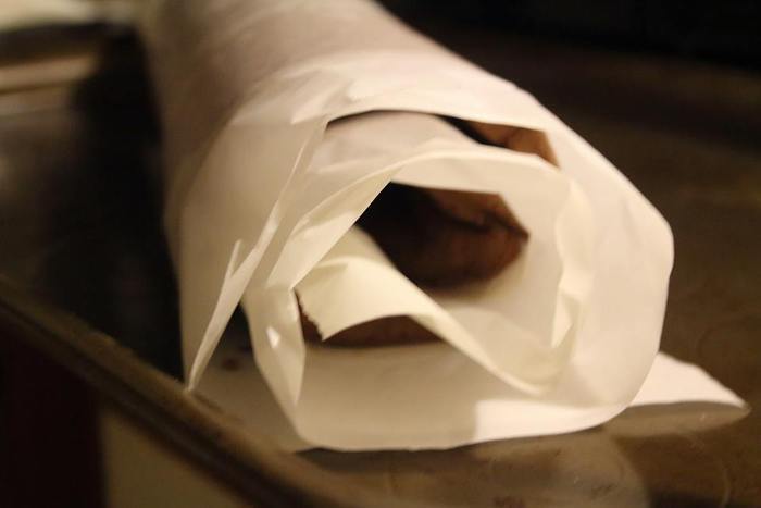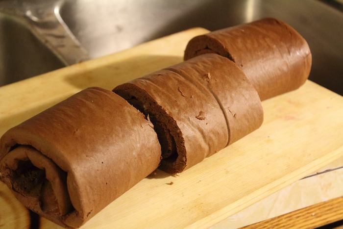 Рулет промазать кремом и завернуть. Каждая следующая полоска продолжает оборачивать имеющийся рулет.