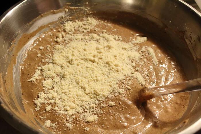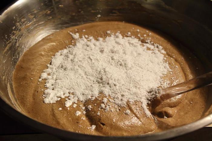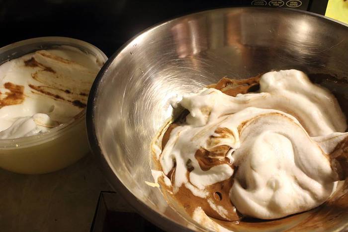 Добавить туда немного белков и снова размешать. Вмешать заворачивающими движениями полученную смесь в белки.