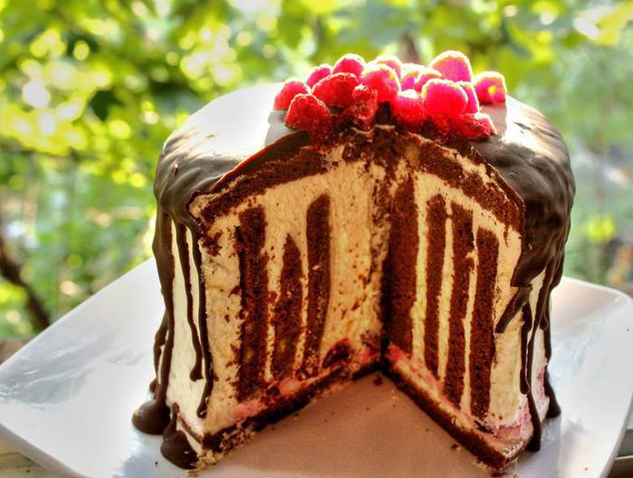 В нем прекрасны три вещи: внешний вид, вкус нежный и легкий (торт сьели сразу весь), полосатая «душа» как результат использования простого рулета, но под другим углом) Бисквит нежный сам по себе, потому в пропитке не нуждается.