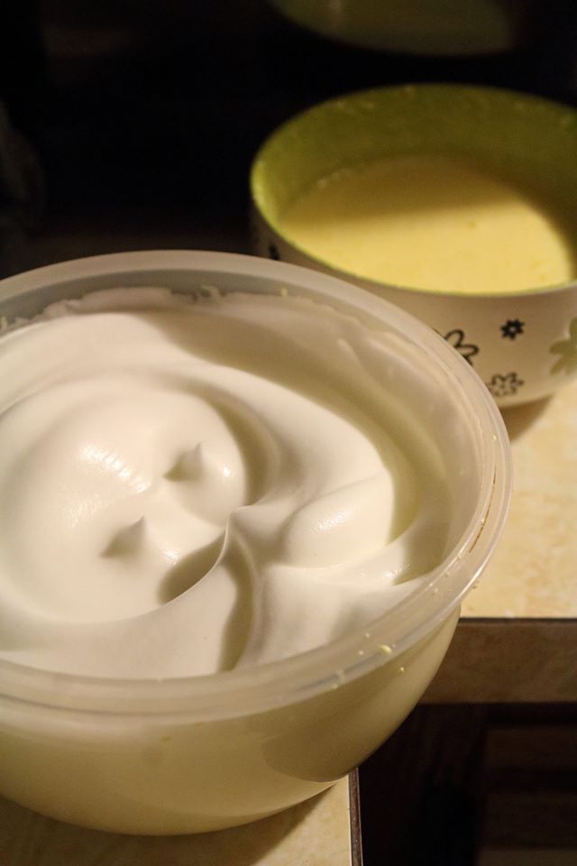 Яйца разделить на желтки и белки. Желтки взбить с половиной сахара в пену. Белки взбить со второй половиной сахара до устойчивых пиков.