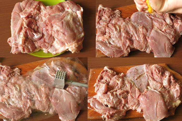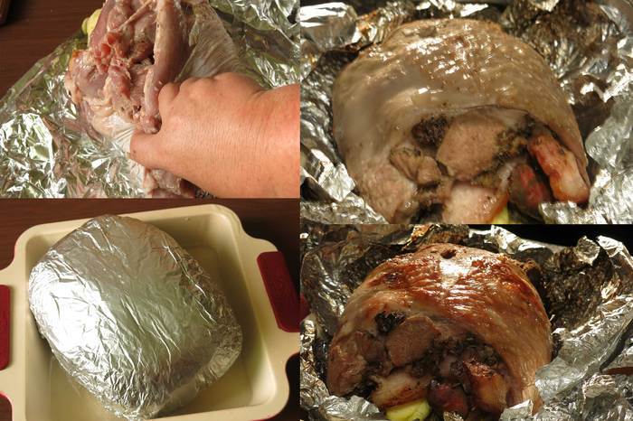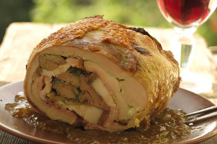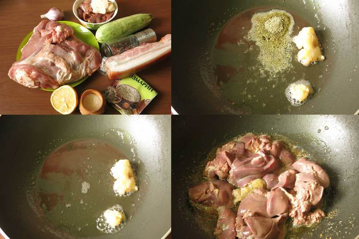 Фаршировать будем бедро индейки, вес около 800 г. С начинкой определились, специи и приправы малокомпонентные. Для маринада — лимонный сок, перец, розмарин, чуть вкуса запеченного чеснока, несколько долек для фаршировки. Топим жир, кладем половину розмарина, обогащаем ароматами. Обжариваем печень, даем схватиться корочке, уменьшаем огонь.