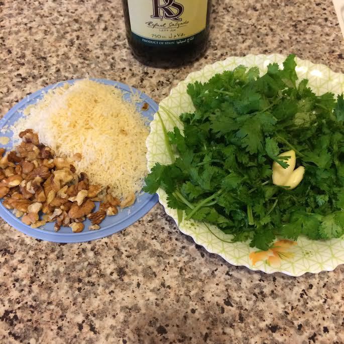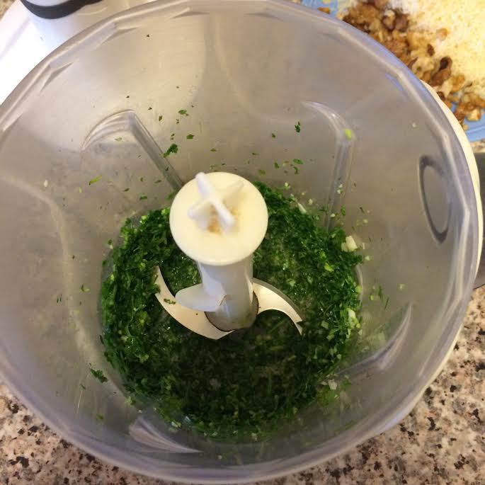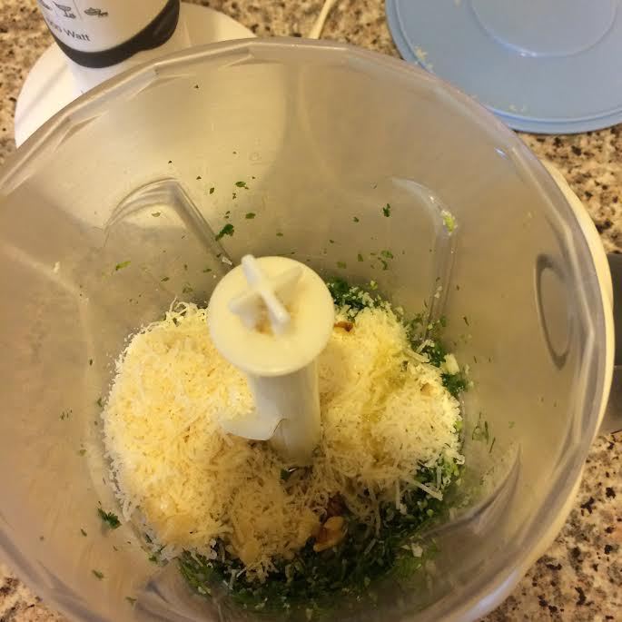 Добавить орехи, пармезан и еще 1 ст. л. масла, взбить.