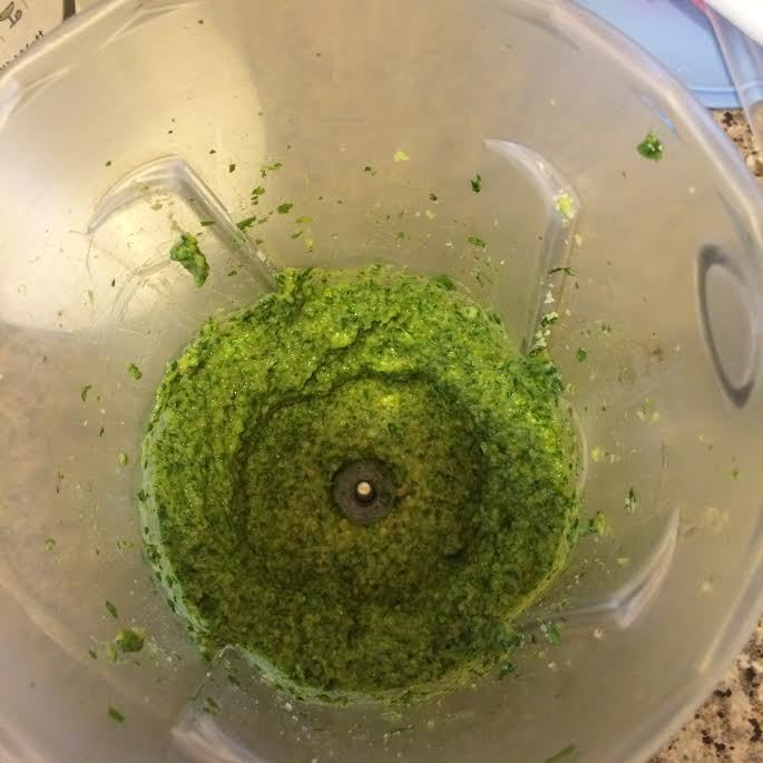 Зелень и чеснок крупно порубить сложить в фудпроцесор или блендер, добавить 1 ст. л. масла и слегка взбить.