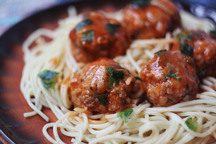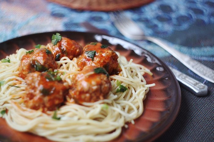Подаем тефтели со спагетти, посыпав сверху свежей петрушкой.
