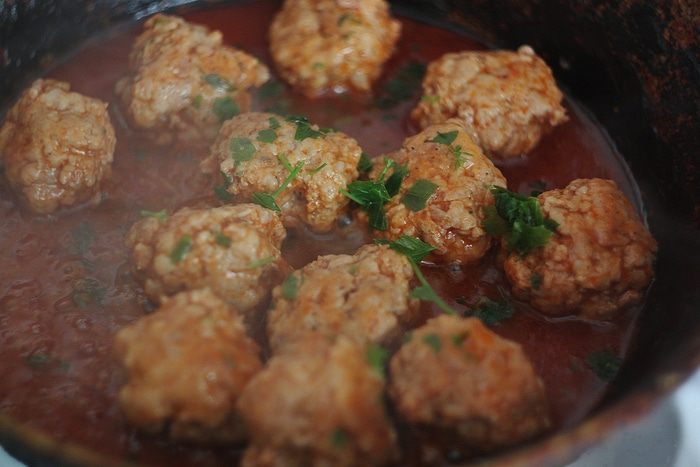 Затем добавляем воду и томатный соус (4 ст. л. или 8 ч. л.), уменьшаем огонь и тушим под крышкой минут 20 — 25, периодически переворачивая тефтели. За 5 минут до готовности добавляем 1 ч. л. порубленной петрушки, перемешиваем.