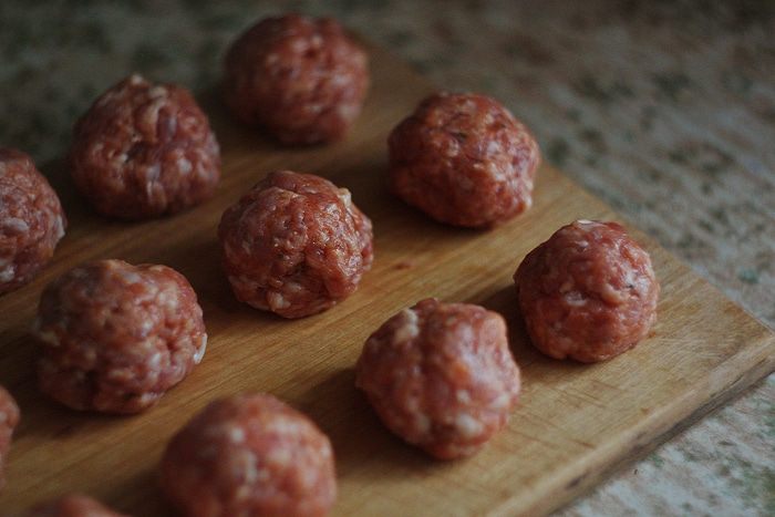 Далее из фарша лепим небольшие шарики размером чуть больше грецкого ореха.