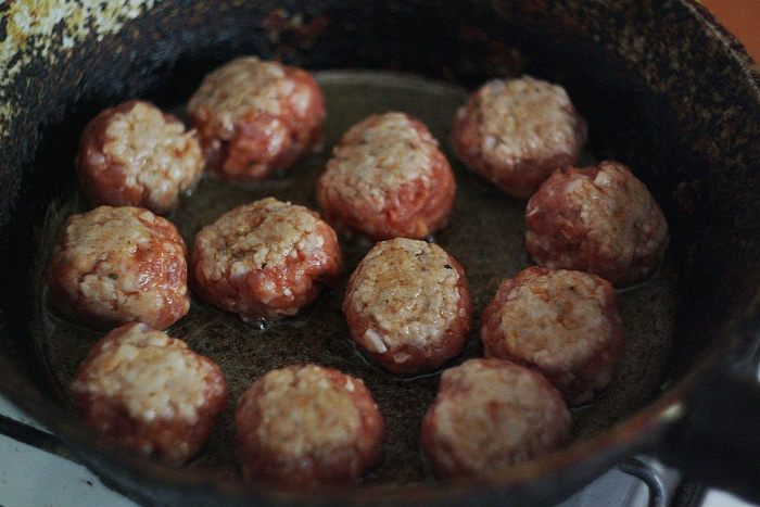 На разогретой с растительным маслом глубокой сковородке обжариваем наши шарики на среднем огне минут 5 — 7 с разных сторон, чтобы они минимально схватились.