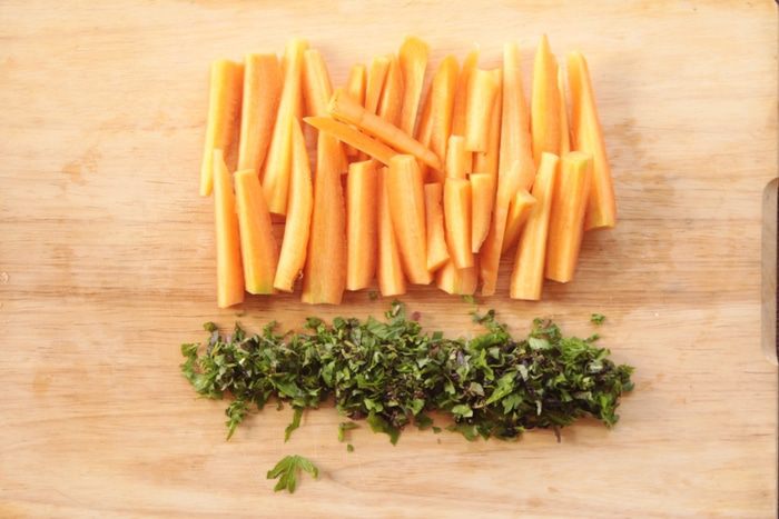 Нам необходимо нарезать морковь и травы (у меня в дело пошли травы, которые растут на моем огородике: базилик, тимьян, мята, душица, розмарин,петрушка, а можно использовать уже готовую смесь сухих прованских трав).