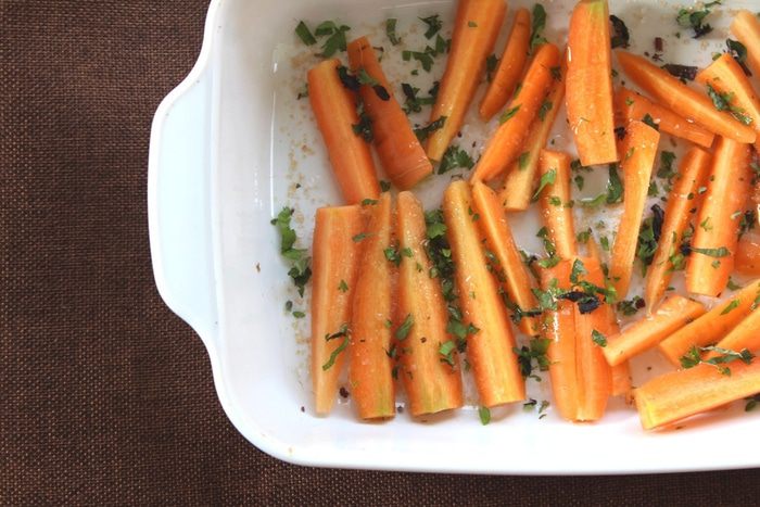 Теперь, разогреем духовку до 200°С. Морковь уложим в форму и соединим с маслом, сахаром, солью и травами. Все перемешаем. Ставим в духовку на 20 — 25 минут. Степень готовности определяем по золотистому цвету и мягкости моркови.