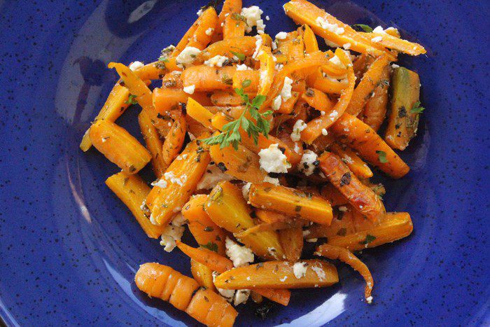 20 минут пролетели незаметно. Достаем нашу морковь и добавляем брынзу/фету.