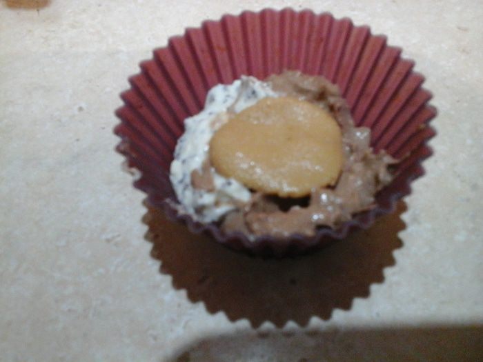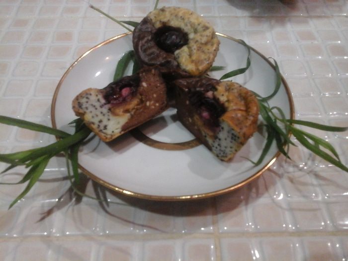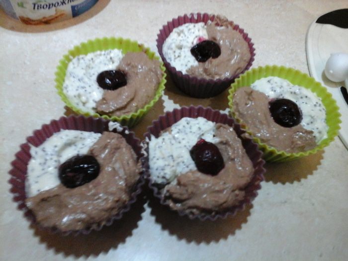 И снова выкладываем смеси. Так, чтобы маковая оказалась на маковой, а шоколадная — на шоколадной. В середину утапливаем вишню. При раскладке нужно учитывать, что тесто поднимется при выпечки.