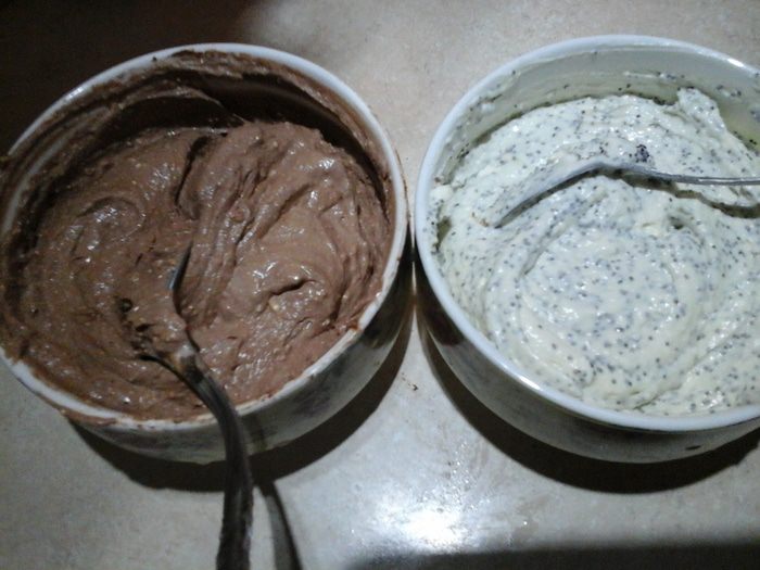 Делим творожную смесь на две равные части. В одну часть добавляем ваниль и мак, а в другую — какао и сметану. Все хорошо перемешиваем.
