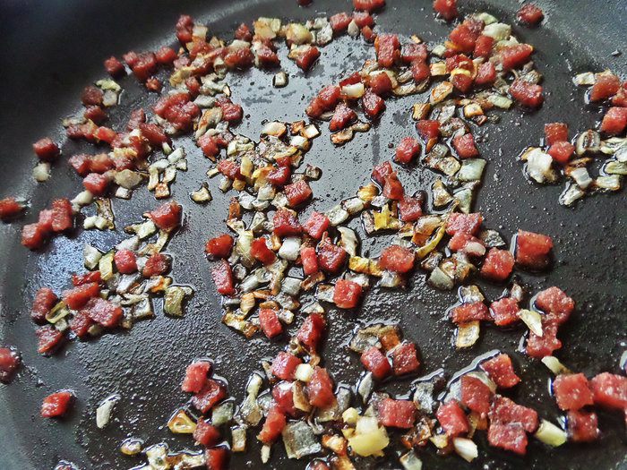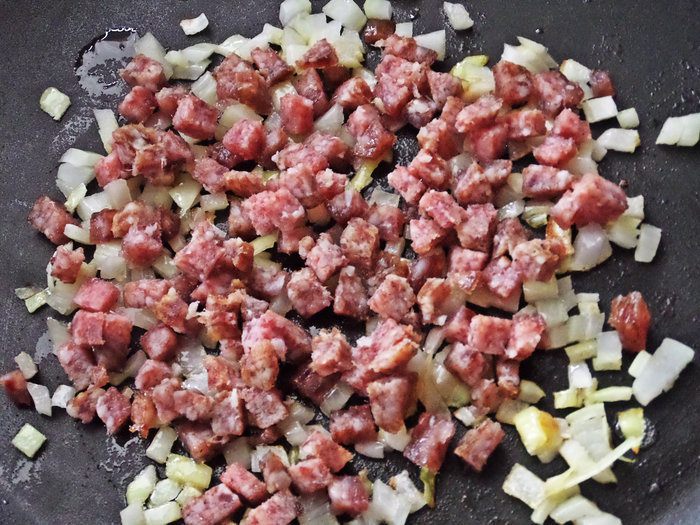 Если используете вареную колбасу,её не обязательно обжаривать.