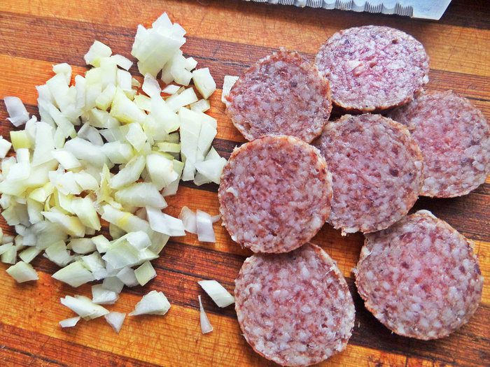 Готовим начинку для омлета: лук измельчить,колбасу нарезать.