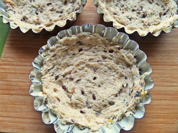 Прижать плотно хлеб к формочкам.