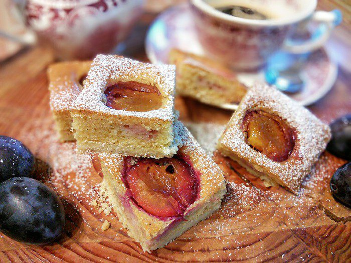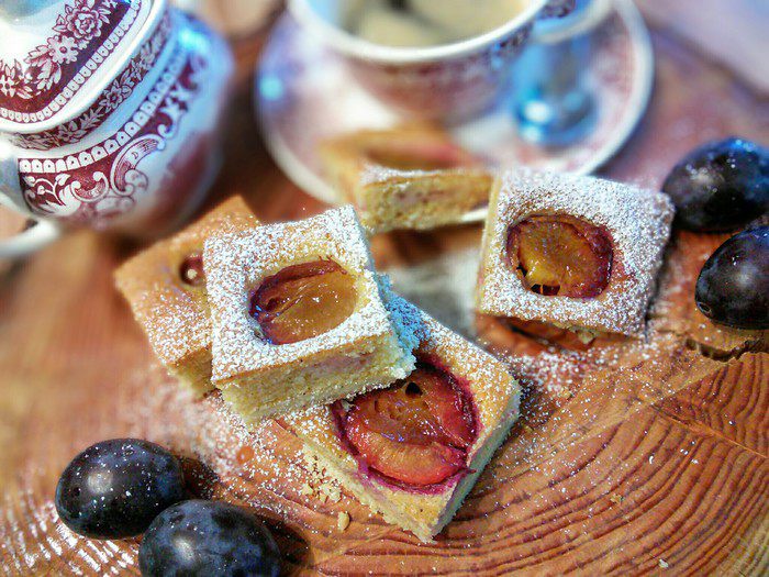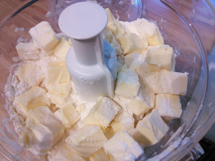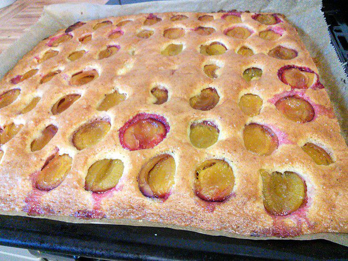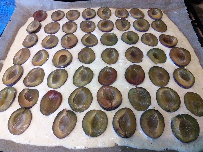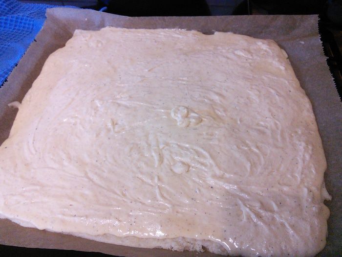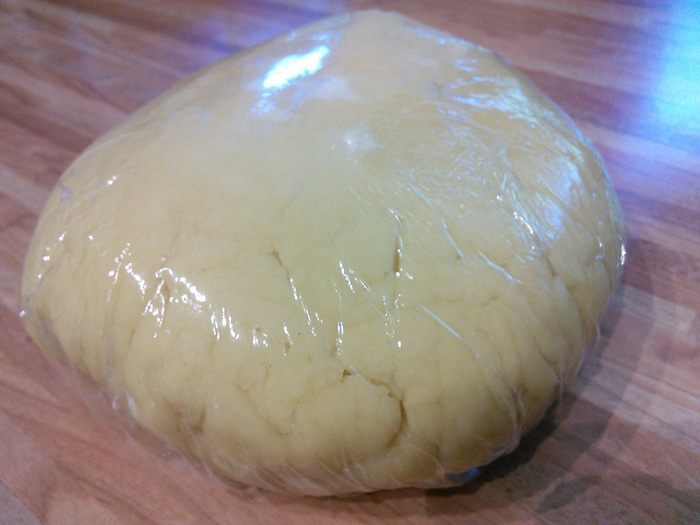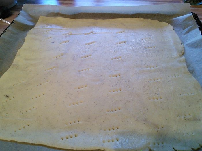Песочное тесто раскатать на посыпанной мукой поверхности, выложить на смазанный маслом противень (можно раскатать прямо на пергаментной бумаге, выложить тесто с бумагой на противень), сделать проколы вилкой. Выпекать корж в заранее разогретой до 175°С духовке 12 минут, вынуть из духовки, немного остудить, духовку не выключать.
