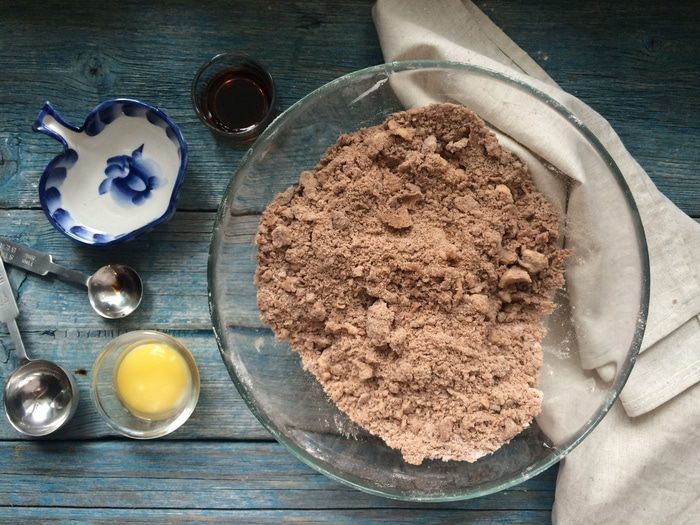 Добавьте сливочное масло, порезанное на кубики, щепотку соли и перемешайте до получения крошки. Введите желток, ванильный экстракт и 2 ст. л. холодной воды.