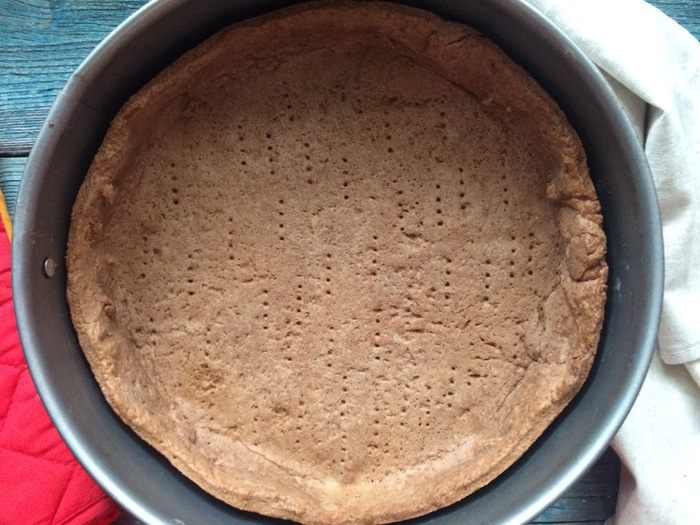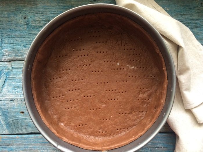 Разогрейте духовку до 200°С. Раскатайте тесто на присыпанной мукой поверхности в круглый пласт диаметром 30 см и толщиной 5 мм. Переложите тесто в форму диаметром 23 см и разровняйте по дну и стенкам. На дне тесто наколите вилкой в нескольких местах и уберите в холодильник на 20 минут.