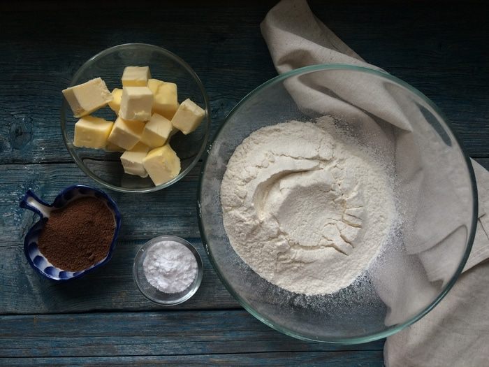 Для теста: в миску просейте муку, какао и сахарную пудру.