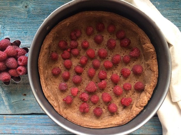 На остывший корж выложите малину, посыпьте сахаром и залейте шоколадной начинкой. Выпекайте 20 минут, пока начинка не застынет, но в центре будет чуть жидкой. Остудите на решетке, затем выньте из формы, нарежьте и подавайте.