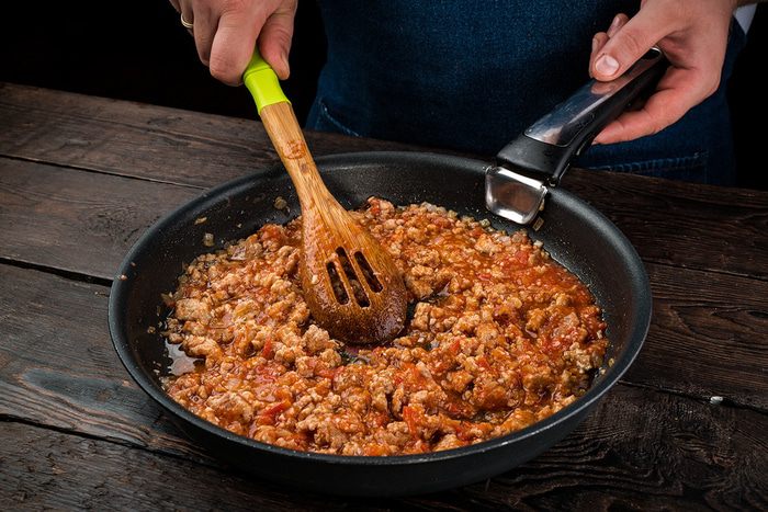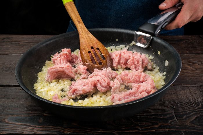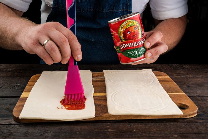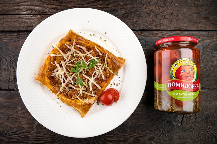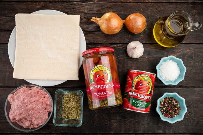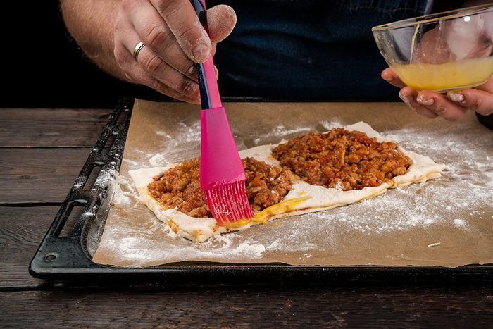 С помощью стакана сделать углубления в центре и выложить чайной ложкой мясную начинку, придавливая в тесто. Накрыть полотенцем, дать время на расстойку минут 10 — 15 и выпекать в предварительно разогретой духовке при температуре 180°C до золотистого цвета.